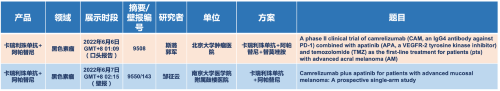 在黑色素瘤领域,A8国际医药的卡瑞利珠单抗联合阿帕替尼(“双艾”组合)在2022 ASCO共入选1项口头报告和1项壁报展示。